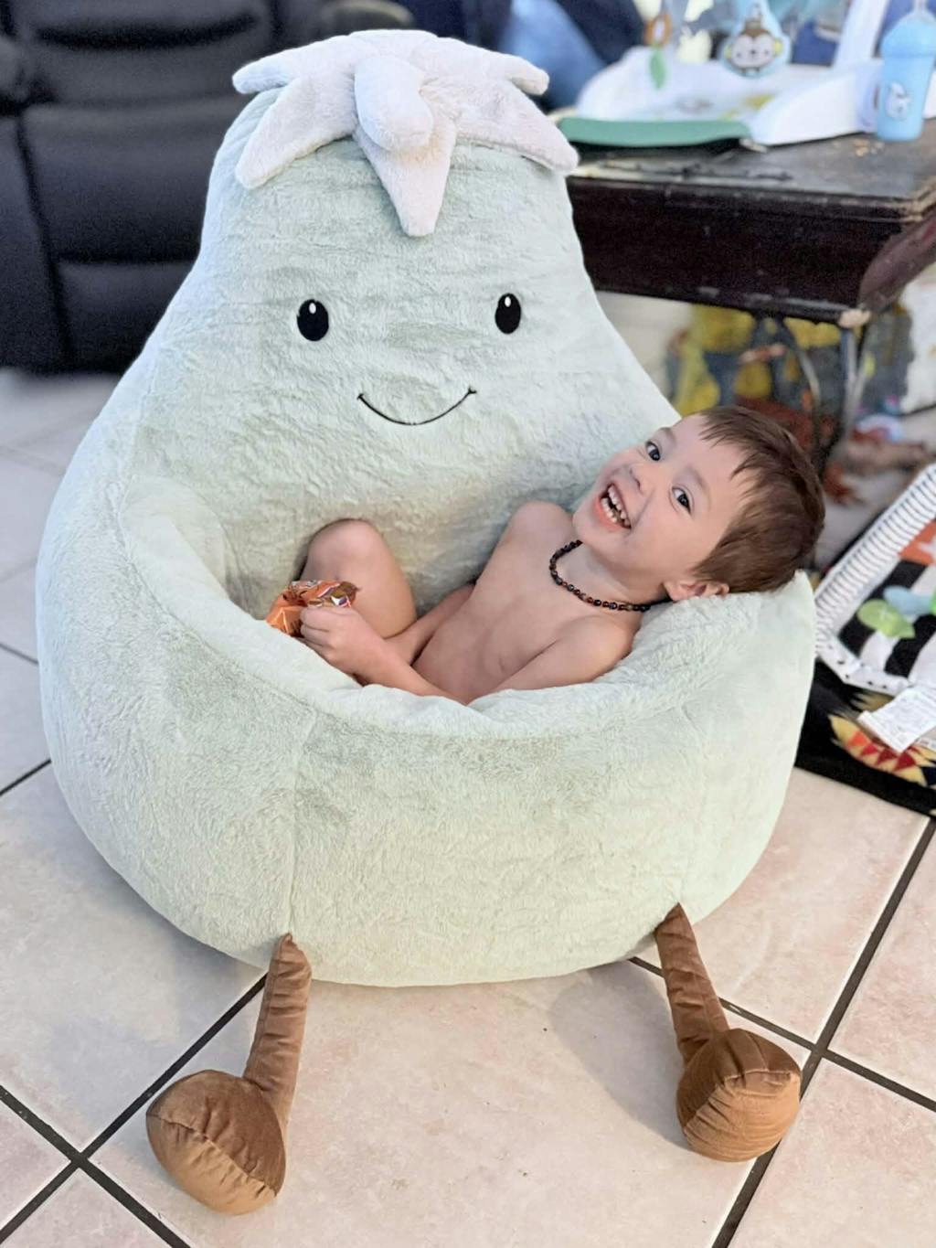 - Cute & Characterful Design: "With its cheerful smiley face, soft green leafy top, and tiny brown 'feet,' this eggplant-shaped seat transforms any room into a magical play space. Watch as your child's imagination blooms with every hug and play session!"