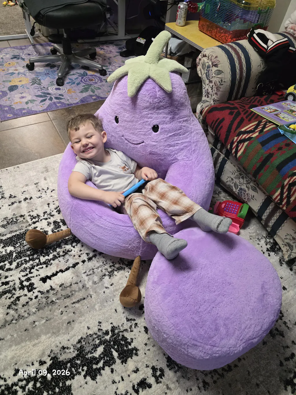 - Cute & Characterful Design: "With its cheerful smiley face, soft green leafy top, and tiny brown 'feet,' this eggplant-shaped seat transforms any room into a magical play space. Watch as your child's imagination blooms with every hug and play session!"